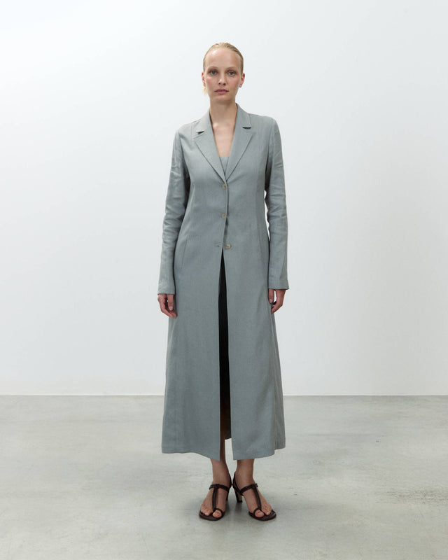 - Long single-breasted duster coat in stretch linen blend fabric