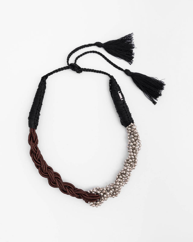 - Necklace made by hand-weaving cords covered with colored threads and braids of metal beads